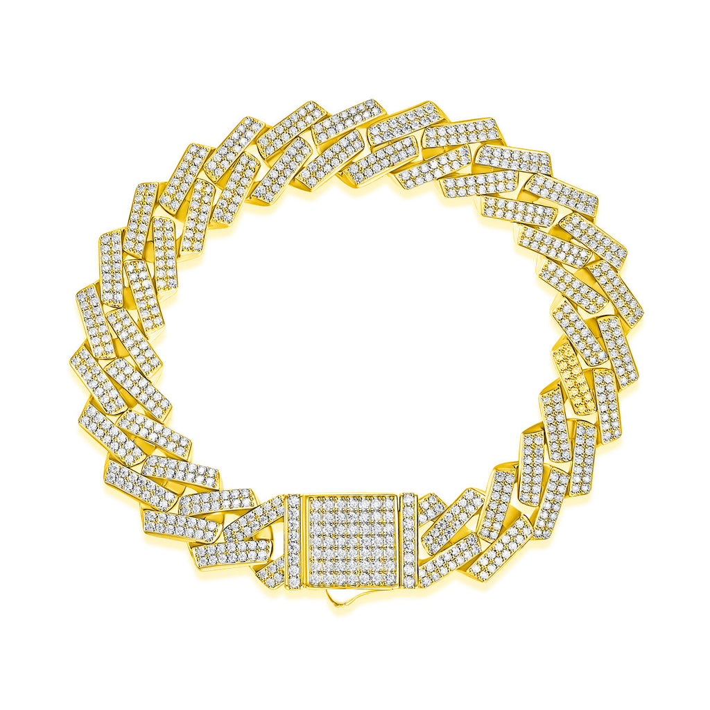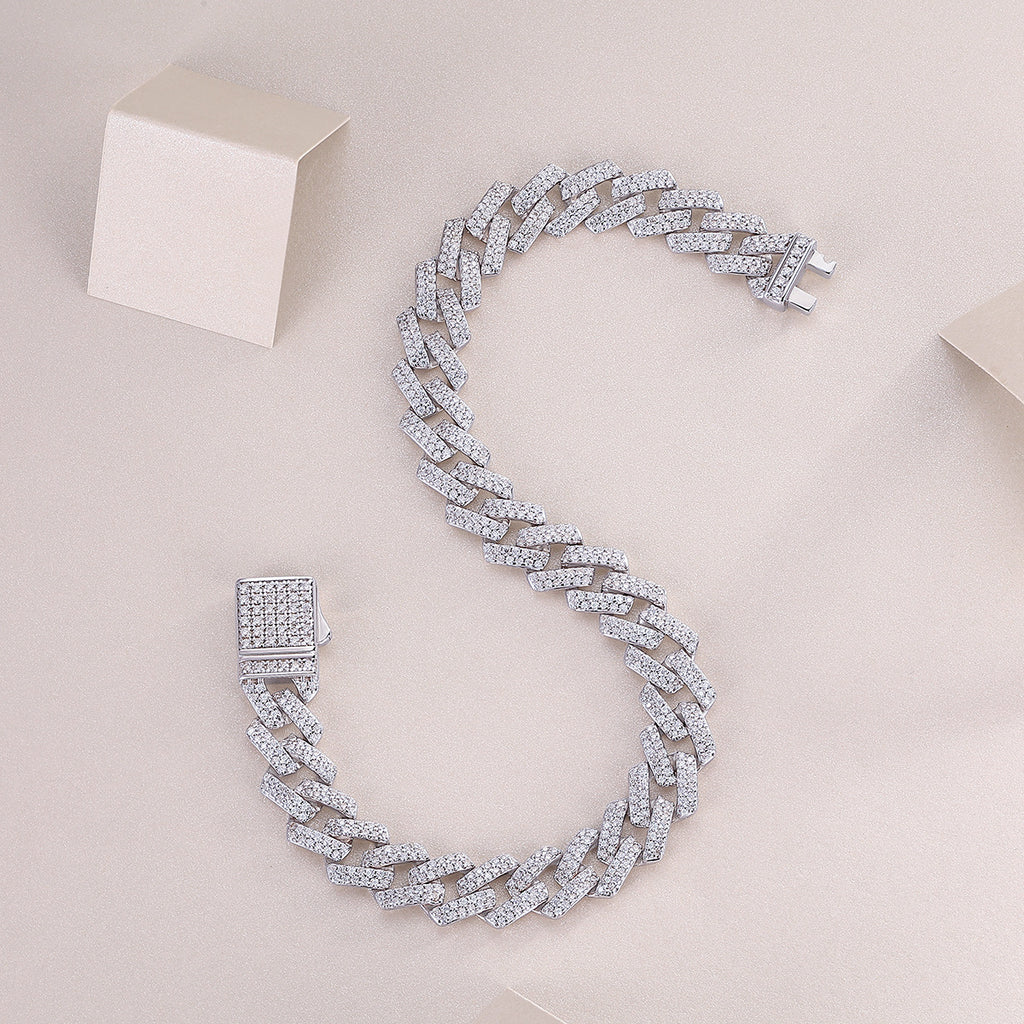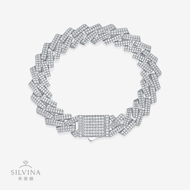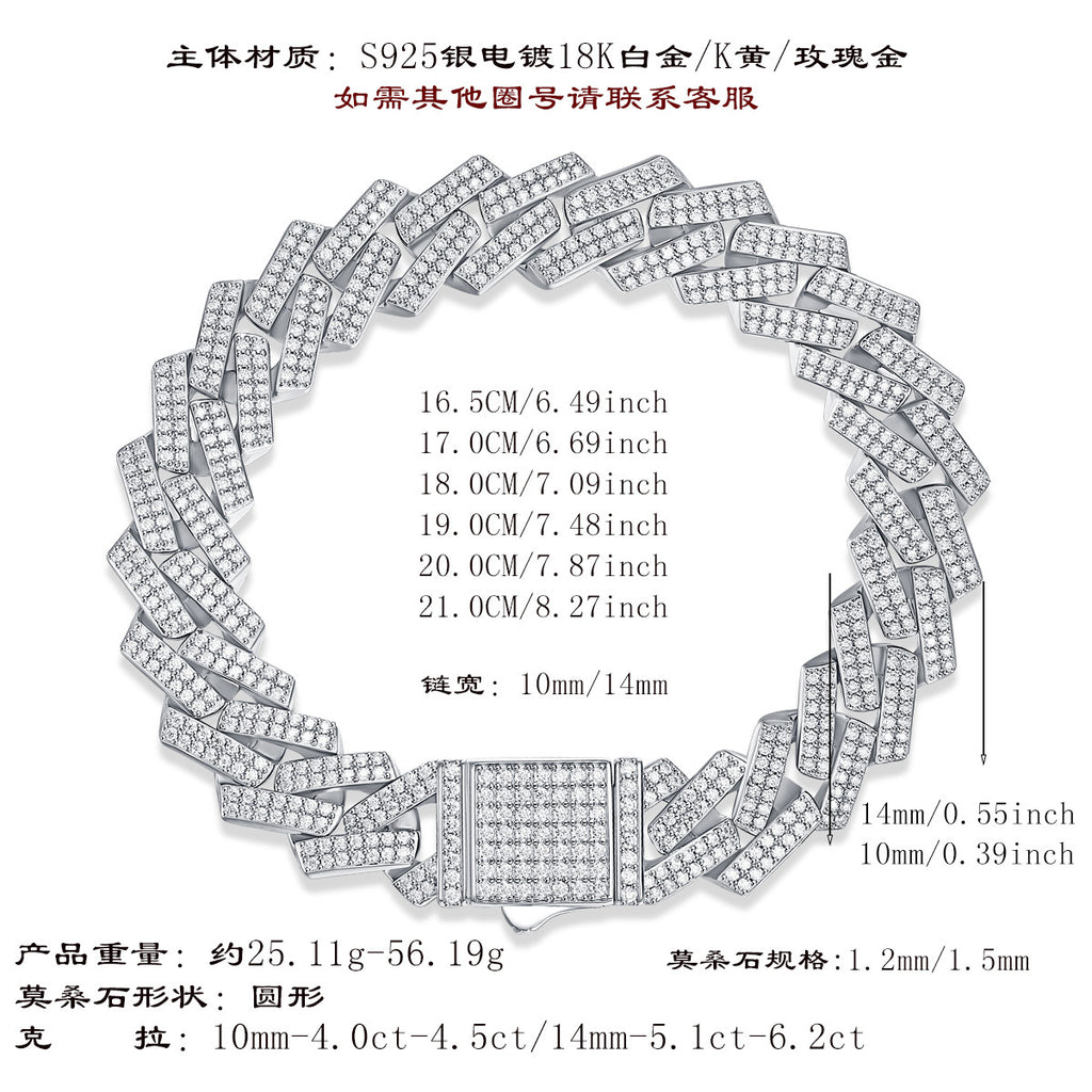 跨境亚马逊夸张嘻哈双排手链电镀加厚S925纯银莫桑钻男女古巴手链